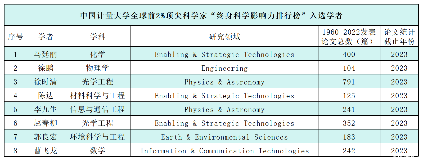 8位学者入选全球前2%顶尖科学家“终身科学影响力排行榜”,分别是化学学科的马廷丽,物理学学科的徐鹏,光学工程学科的徐时清、赵春柳,材料科学与工程学科的陈达,信息与通信工程学科的李九生、环境科学与工程学科的郭良宏、数学学科的曹飞龙。