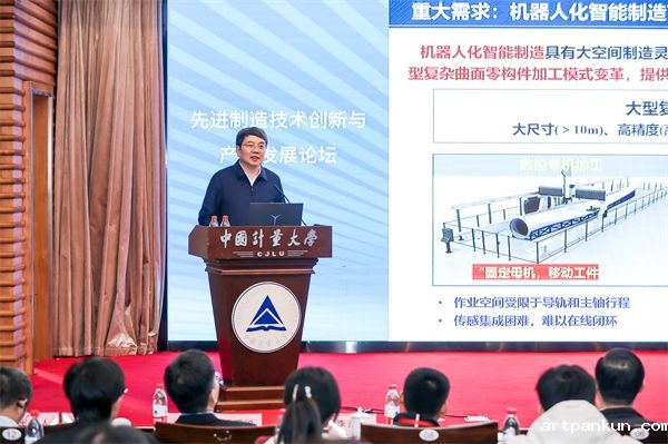 华中科技大学教授、国家级领军人才李文龙以《航空大构件机器人铣削精度保障技术研究及测试验证》为题作主旨报告。李教授全面介绍了团队在三维视觉测量、机器人检测和机器人加工应用方面的研究成果、技术挑战和未来规划,强调了技术创新和实际应用的重要性。