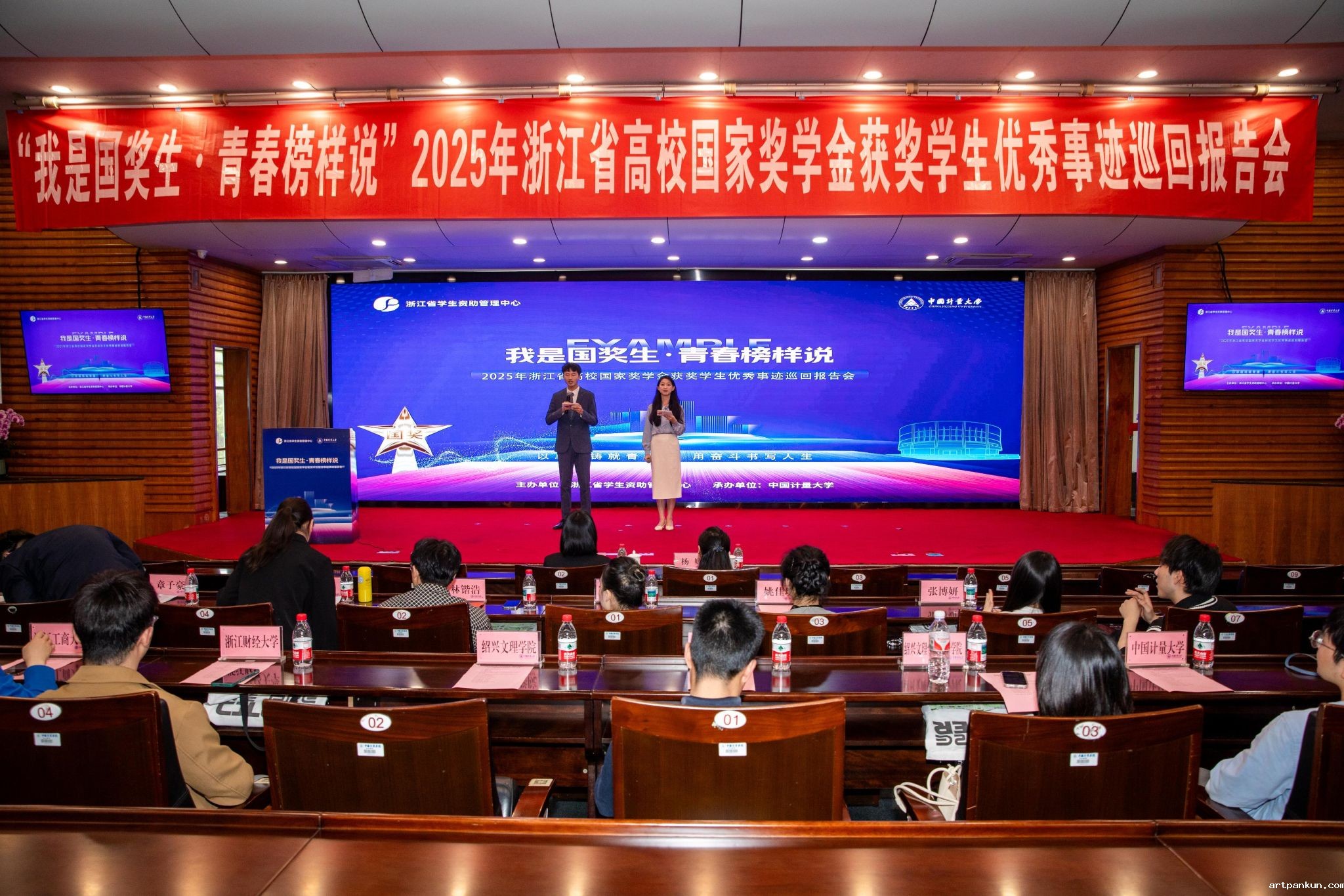 为全面落实党的二十大关于青年人才培养的重要精神,充分发挥国家奖学金获奖学生的示范引领作用,2025年4月24日下午,由浙江省教育发展中心主办、雷电竞ray官网承办,“我是国奖生・青春榜样说”2025年浙江省普通高校国家奖学金获奖学生优秀事迹巡回报告会在我校闻厅二楼报告厅举办。来自省内九所高校的杰出青年代表齐聚我校,以青春叙事传递奋斗力量,用榜样之光引领成长航向,为量大学子带来一场精神洗礼与思想启迪的盛会。浙江省教育发展中心、浙江省学生资助管理中心干部陈琴,学生处处长杨娜,各学院辅导员及学生代表参加了此次报告会。