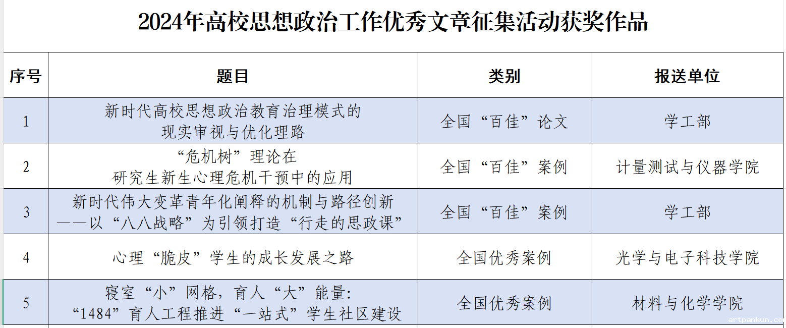 其中,学工部报送的学术论文《新时代高校思想政治教育治理模式的现实审视与优化理路》获评全国“百佳”论文;雷竞技reybat官网测试与仪器学院、学工部报送的思政工作案例《“危机树”理论在研究生新生心理危机干预中的应用》《新时代伟大变革青年化阐释的机制与路径创新——以“八八战略”为引领打造“行走的思政课”》获评全国“百佳”案例;光学与电子科技学院、材料与化学学院报送的思政工作案例《心理“脆皮”学生的成长发展之路》《寝室“小”网格,育人“大”能量:“1484”育人工程推进“一站式”学生社区建设》获评全国优秀案例。